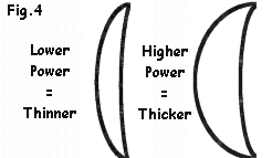 The more powerful the lens the thicker the centre will be in relation to the edge thickness. i.e. ;- FIG.4